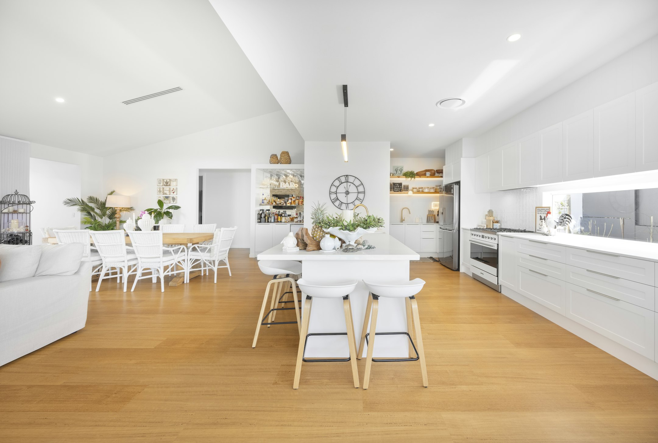 - Moving into the living area with raked ceilings and a Chef's dream kitchen is a huge stone island bench with a farmhouse sink that fits six chairs for that cheese platter and conversation and huge window looking out to the tranquil backyard garden.