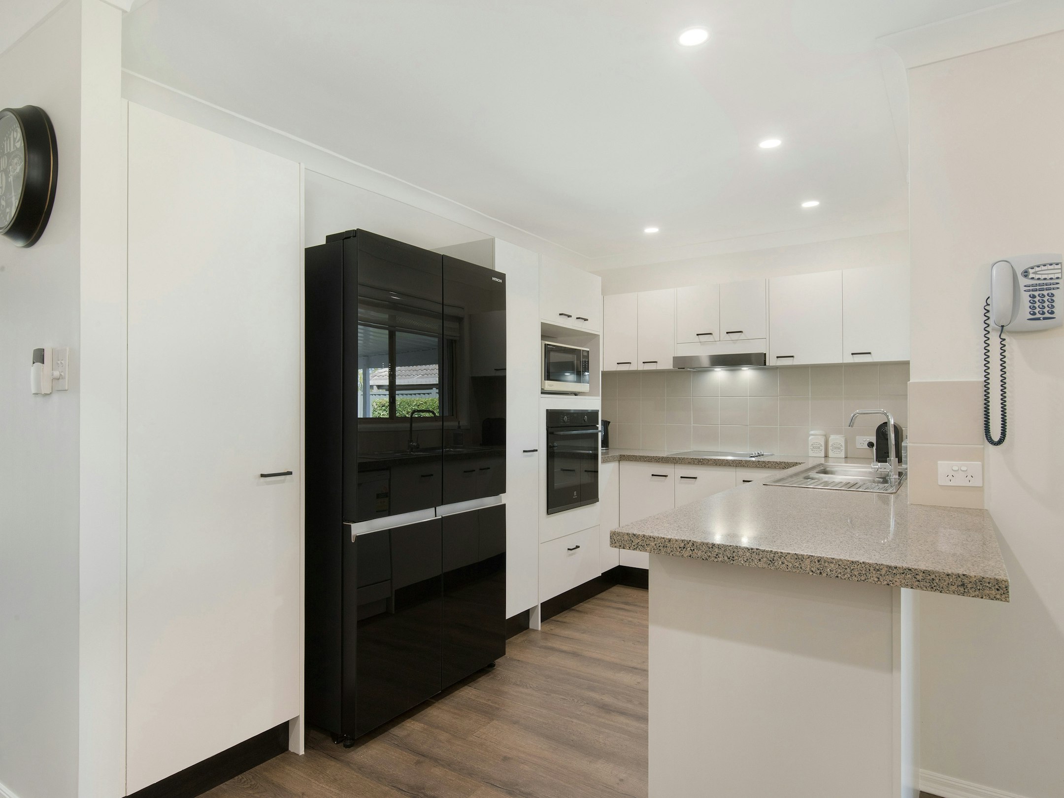 - Kitchen with stone bench top, breakfast bar, dishwasher & electric cooktop
