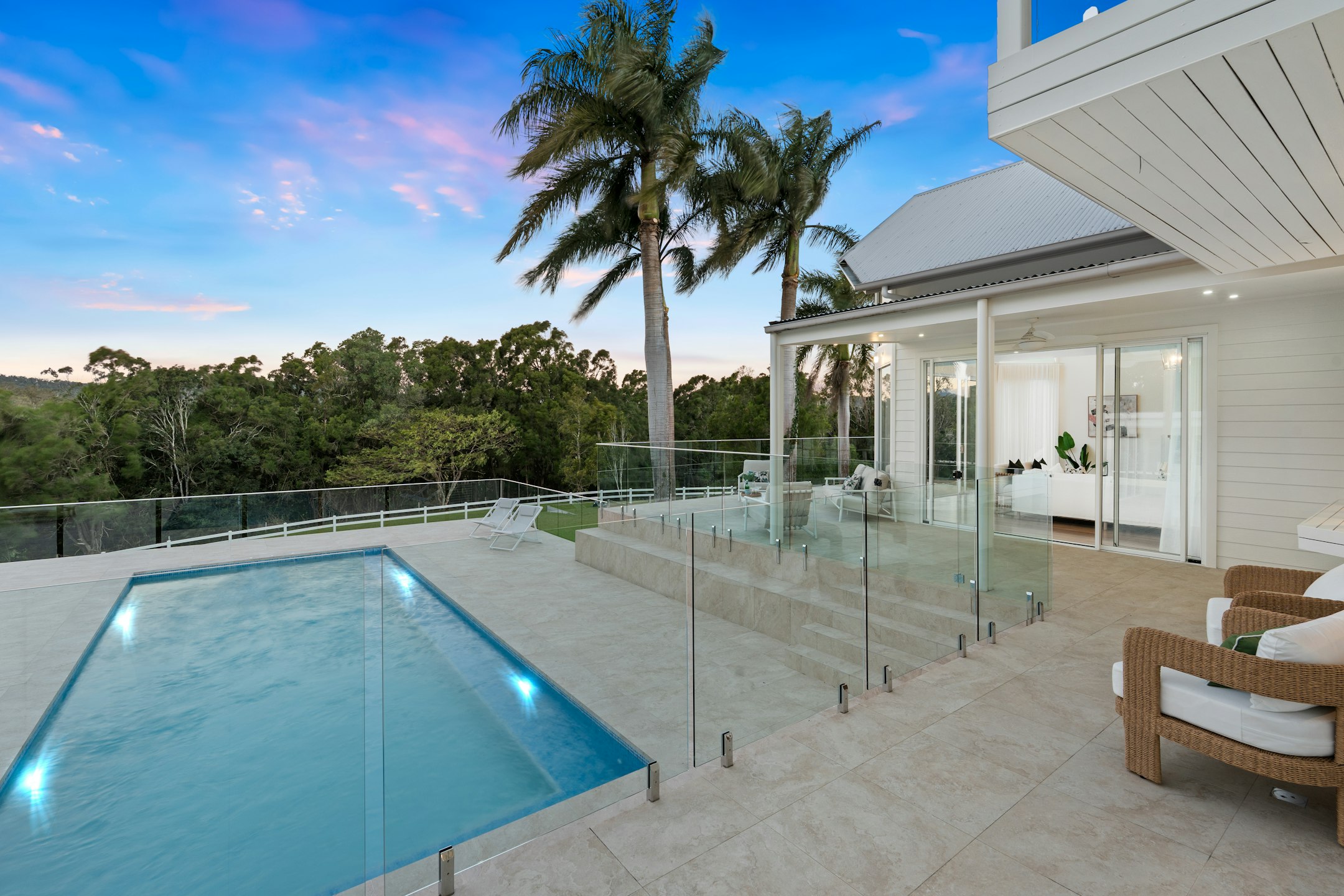 - Master bedroom features a raked ceiling, push-touch built-in robes, spa ensuite with twin vanities, rainfall shower and a balcony with views over the pool and lawns