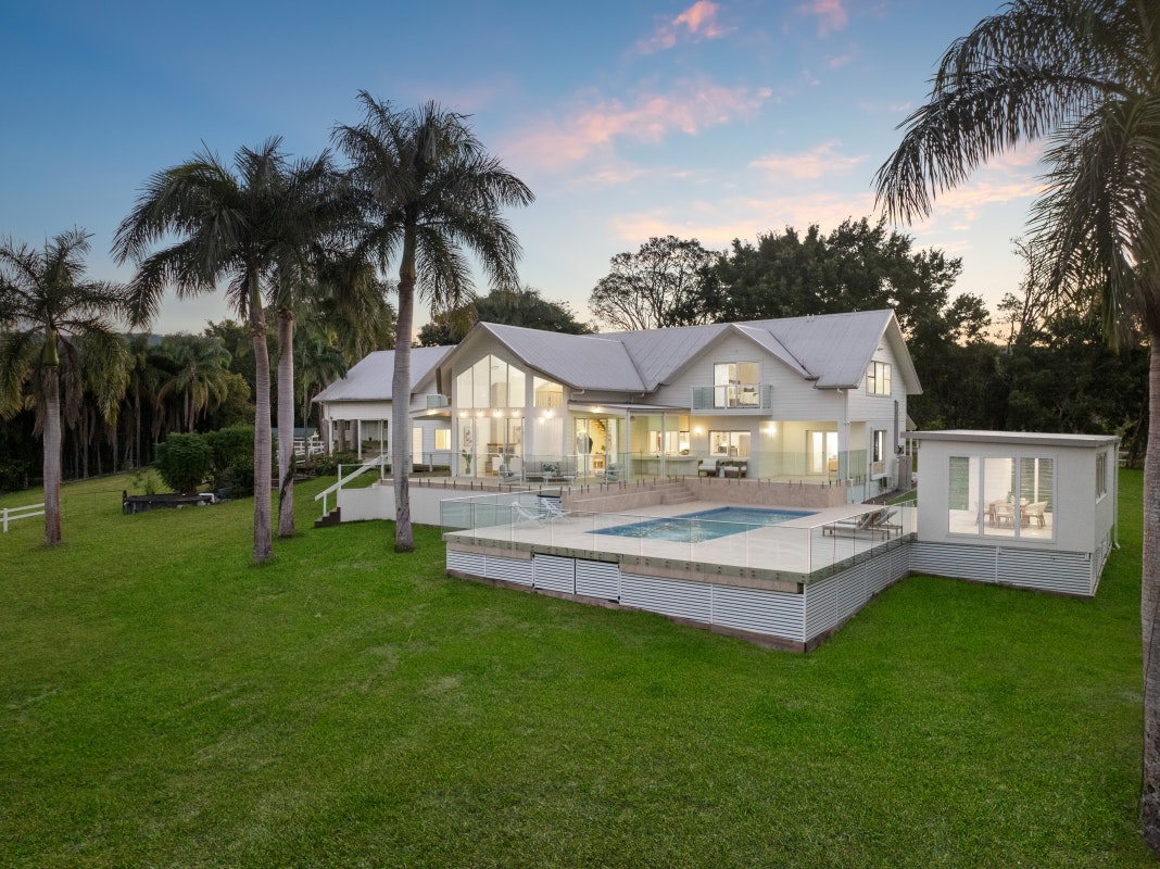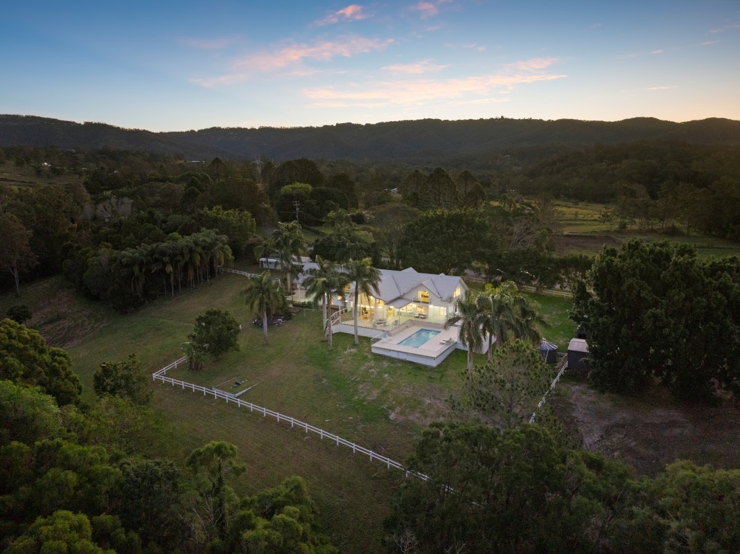 Enjoying a peaceful and elevated setting, the property offers privacy, natural beauty and lifestyle flexibility within 30 minutes of the beach and under an hour to Brisbane. A spacious two-level Hamptons-inspired main residence is accompanied by a self-contained cottage, equine facilities, multiple sheds and approximately 311 metres of river frontage.